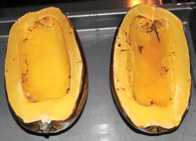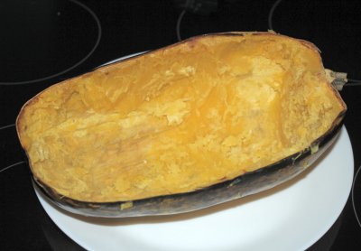 Zubereitung: Kürbishälften in den bei 180°C vorgeheizten Backofen legen (offene Seiten nach oben). Wasser direkt auf das Backblech geben, ca. 1cm hoch (um den Kürbis herum). 30 - 40 Minuten garen (je nach Größe).