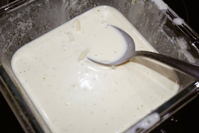 Crème fraîche mit Sahne verrühren, mit Pfeffer und gekörnter Brühe kräftig würzen, geriebener Käse hinzufügen.