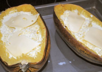 Da der Kürbis mild ist, die Sahnemischung gut würzen. Evtl. jeweils mit einer Scheibe Käse belegen. Dann nochmal ca. 15 - 20 Minuten bei 180°C überbacken. Der Käse sollte es leicht gebräunt sein. Das Gericht kann man im Kürbis servieren.