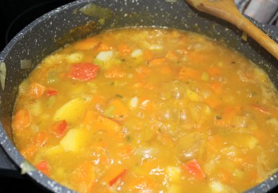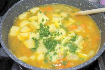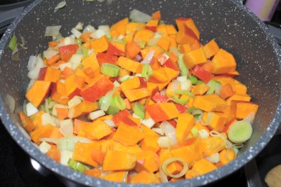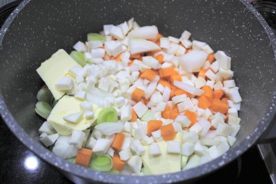Vorbereitung: Zwiebel schälen, in Würfel schneiden, Lauch waschen und klein schneiden, Karotten schälen, in Würfel schneiden, Sellerie in Würfel schneiden, Petersilienwurzel in Würfel schneiden, Petersilie zerhacken, Apfel - Kerngehäuse entfernen, schälen in Würfel schneiden, Kürbis - zerteilen, Kerne entfernen und in Würfel schneiden, Kartoffeln schälen, waschen und in Würfel schneiden.