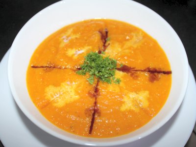 Topf vom Herd nehmen und alles mit dem Zauberstab pürieren. Die Suppe mit Sahne verfeinern und mit Kürbiskernöl und Petersilie dekorieren.