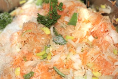 Vorbereitung Zwiebel schälen und in ganz kleine Stücke schneiden Lauch gut abwaschen, in ganz klein Stücke schneiden Karotten gut abwaschen und/oder schälen Sellerie schälen, waschen, zerteilen Petersilienwurzel Schälen, abwaschen Petersilie gut waschen und Kraut von Stängel zupfen Einige Einmachgläser samt Deckel auskochen, abkühlen lassen.